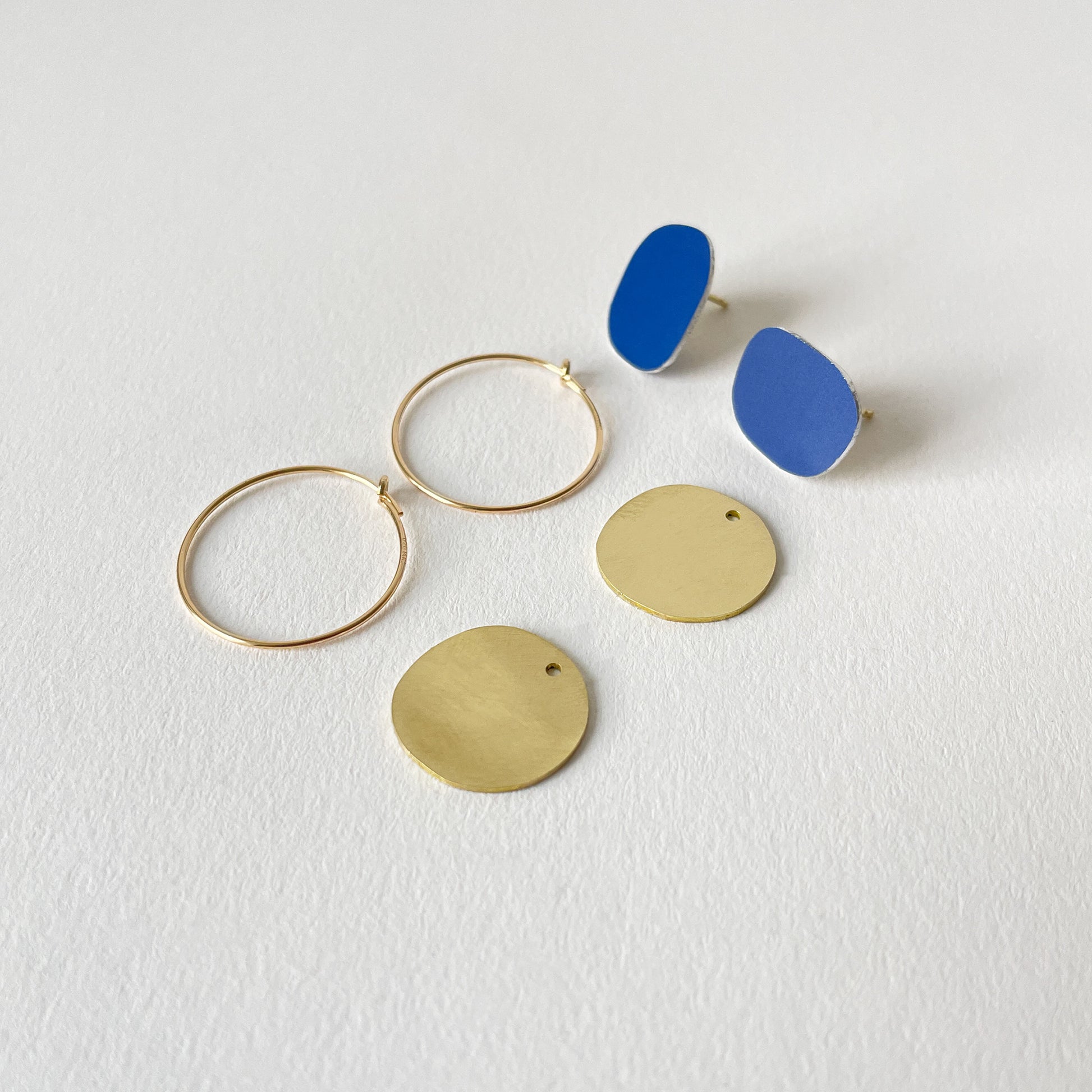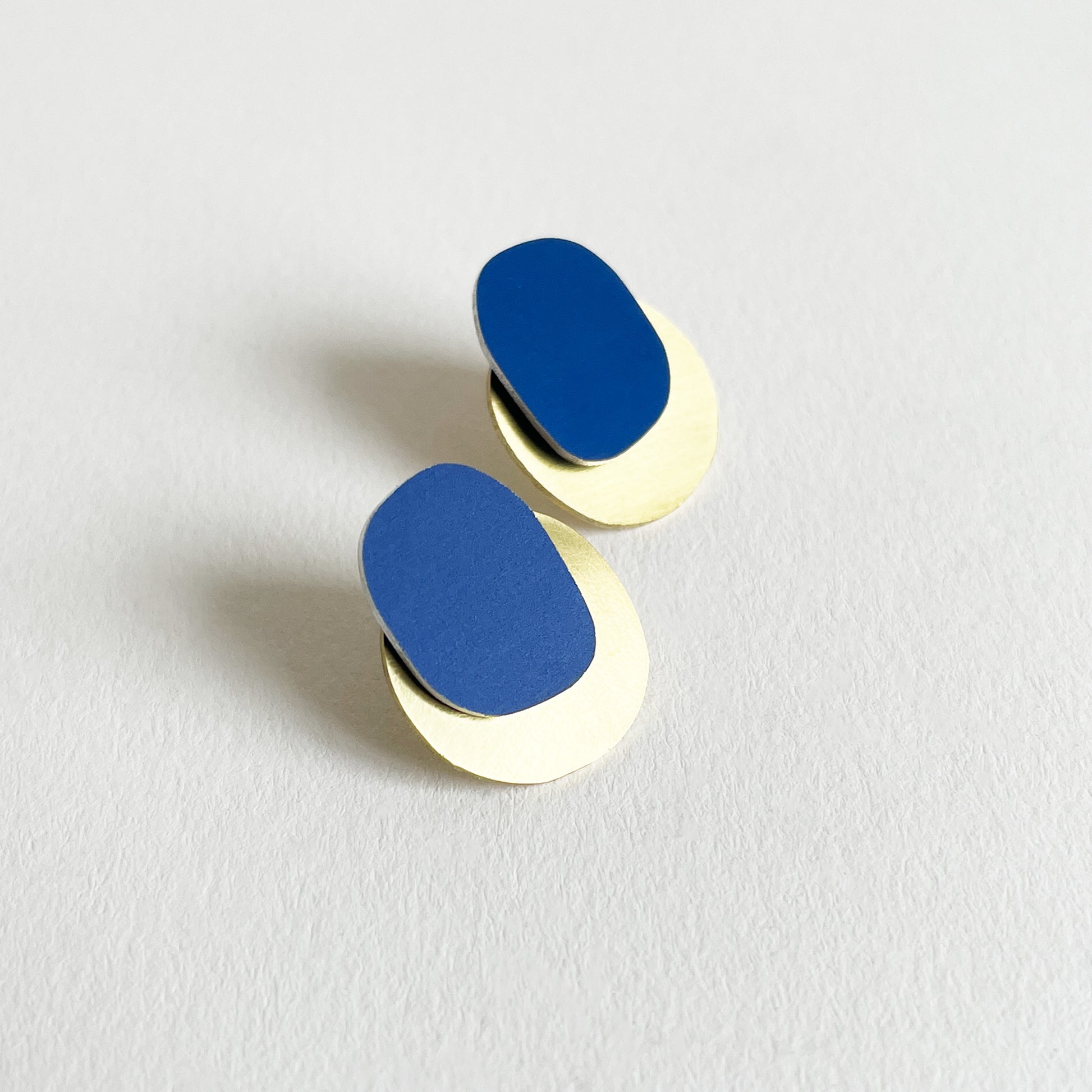 Crafted in simple brushed aluminium and matt anodised aluminium these playful Skim earrings can be worn as layers studs or taken apart and worn as smaller cobalt blue studs or brass hoop drop earrings. Skim earrings have gold plated posts and hoops and are presented in a beautiful Tom Pigeon white sliding box.