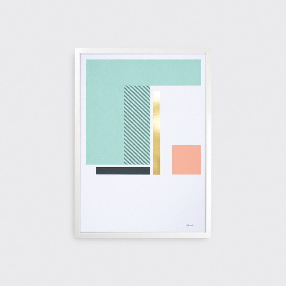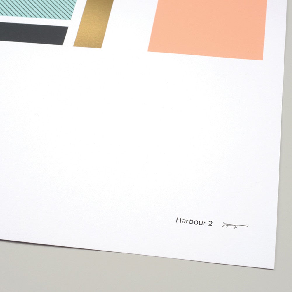 ‘Harbour 2’ is an open edition signed A2 screen print, printed in spearmint, charcoal and coral with a brass metallic foil on heavyweight 270gsm GFSmith Colorplan bright white, 'White Frost' paper.