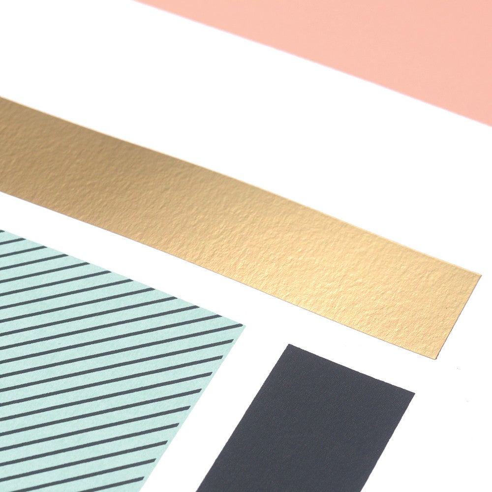 This collection of prints is inspired by the linear structures of three local harbours. Each print is paired back to a series of foiled blocks, simple lines and colour.