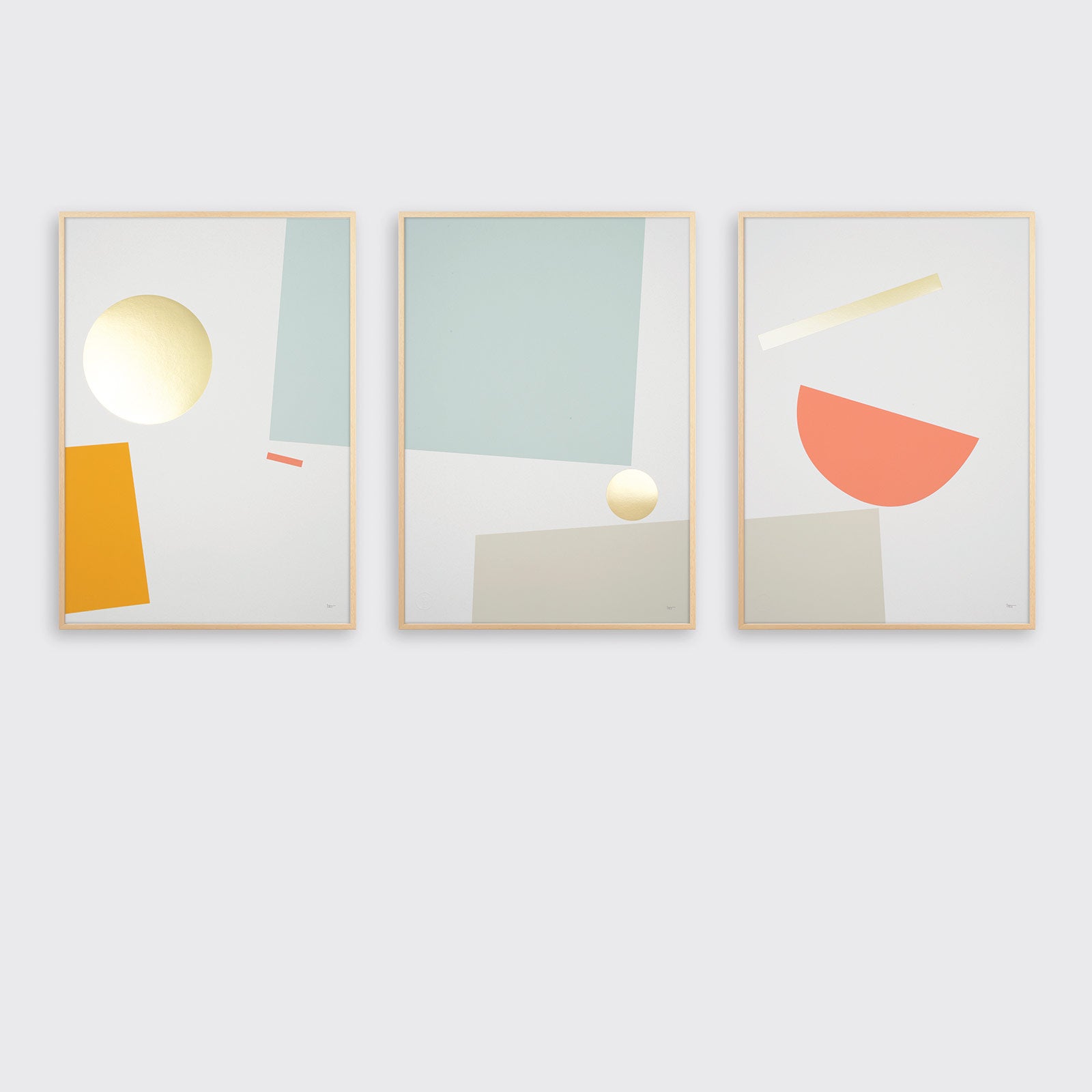 Balance is one of our best-selling prints so we thought we'd bring it to you in a brand new palette of colours. This series of interconnecting foiled screen prints explores the tension and balance between a set of simple geometric shapes, which topple and roll across the three prints.