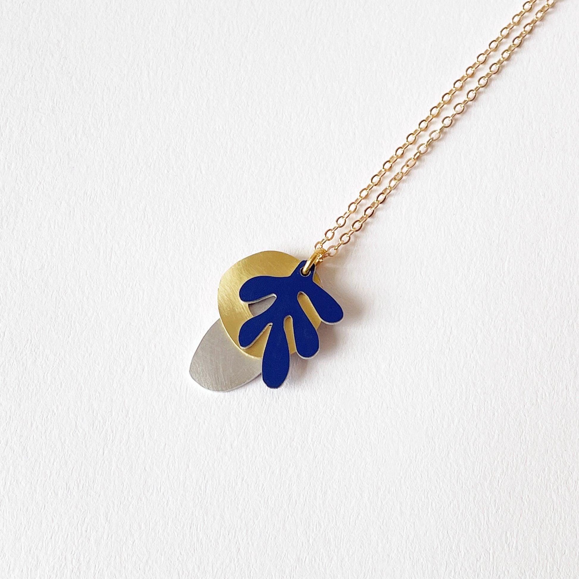 Crafted using charms in brass, cobalt blue and silver tone aluminium, this delicate necklace has a gold plated diamond cut trace chain and is presented in a beautiful Tom Pigeon white sliding box.